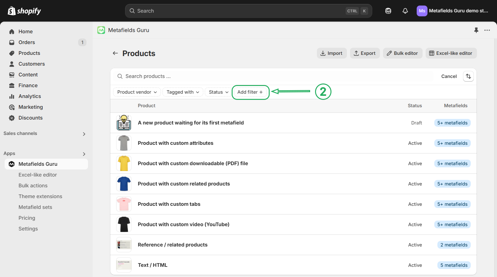 A properly configured metafield definition becomes available in our app's filtering menu. To access such a filter, press the filtering button (1):